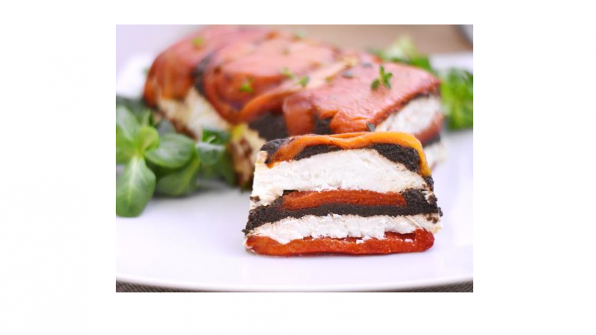 Confectionner la terrine en alternant les couches de poivron, tapenade et crème de chèvre.
